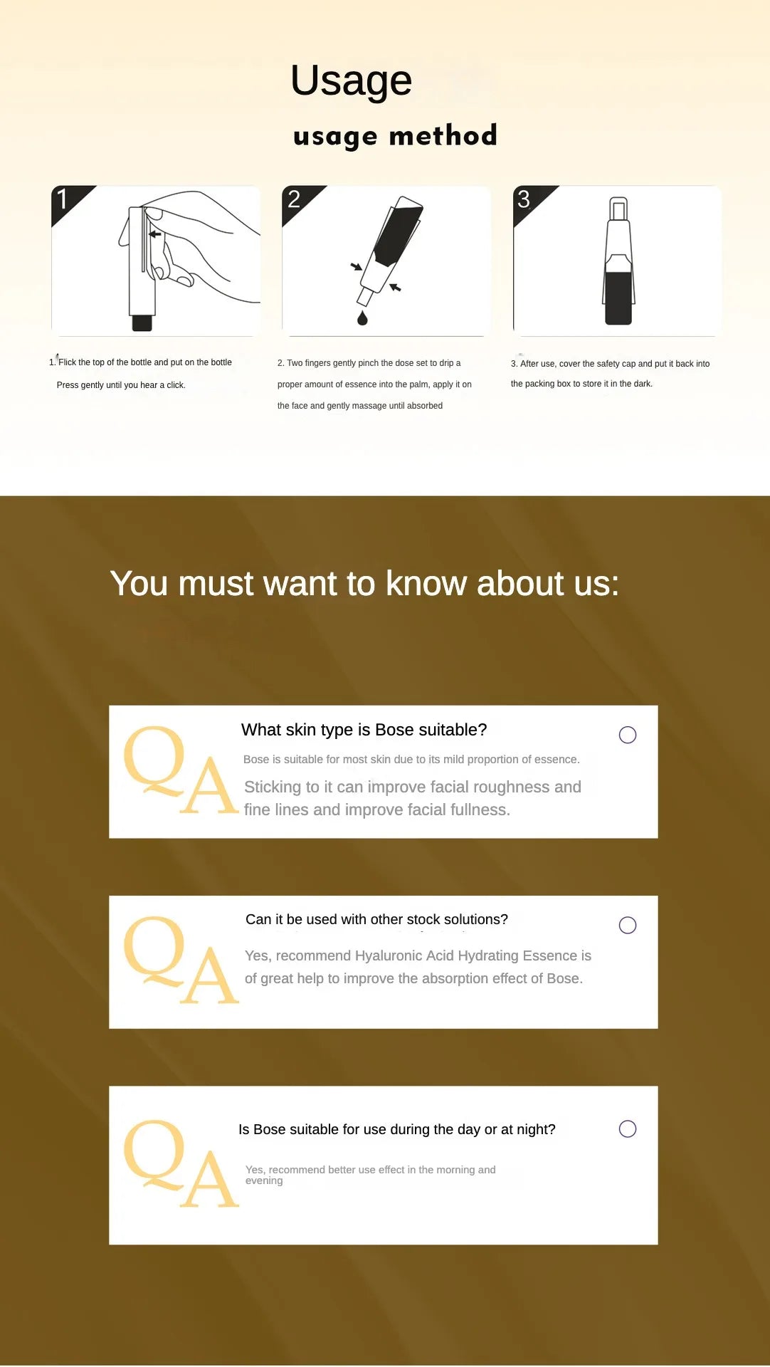 Effect:1. variety active peptides:Promote collagen production, improve skin firmness, eliminate fine lines and wrinkles, and regain firm and youthful skin.