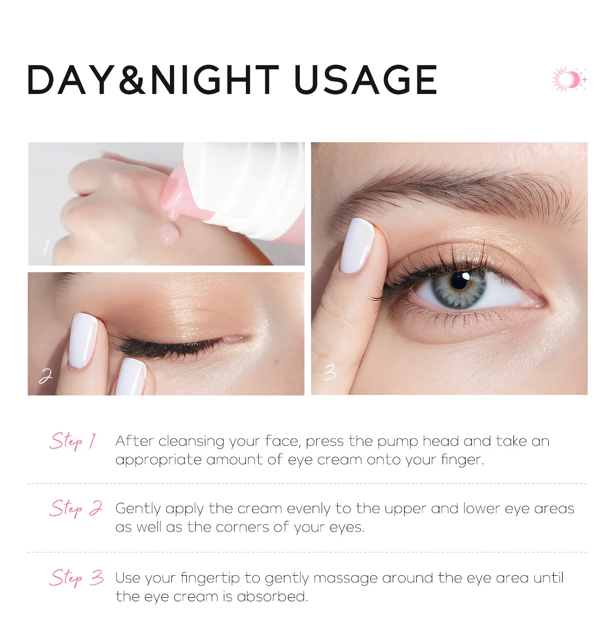 Apply gently to the upper and lower eye areas, including the corners.